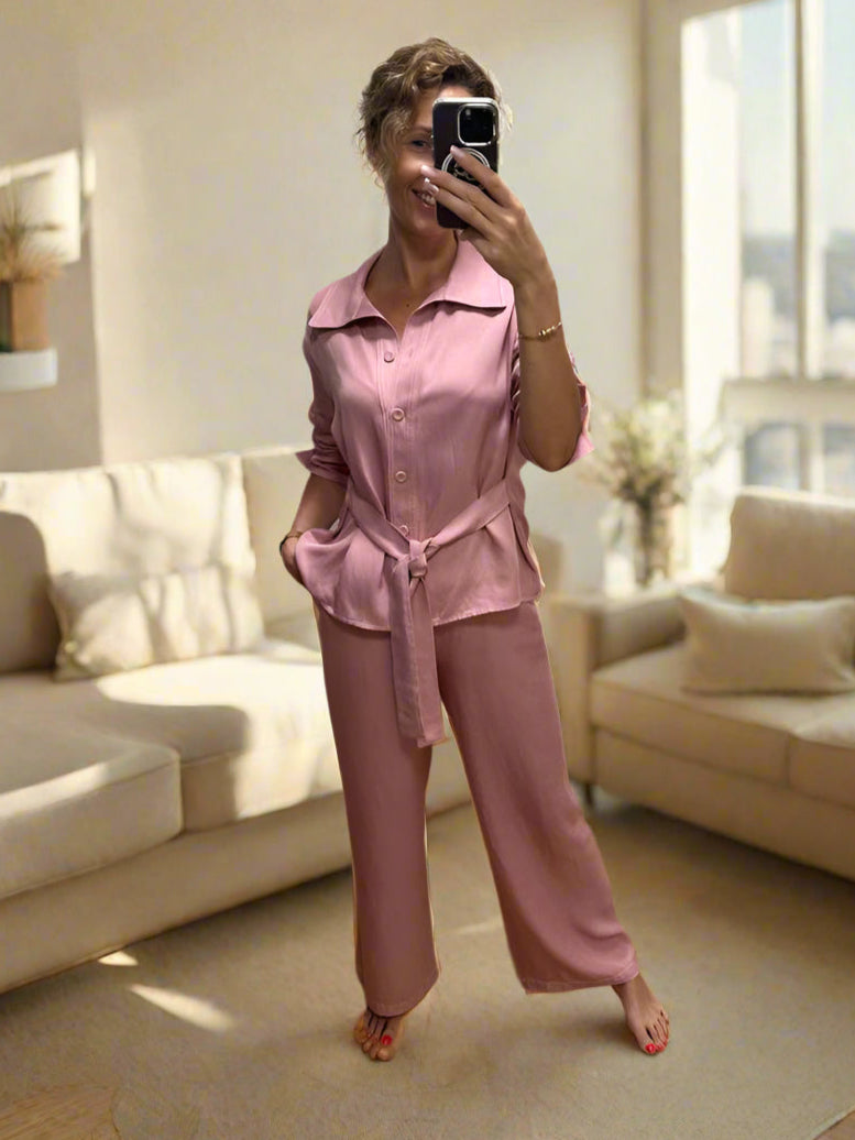 Asimetrinė satino palaidinė su nėriniais, rausva
