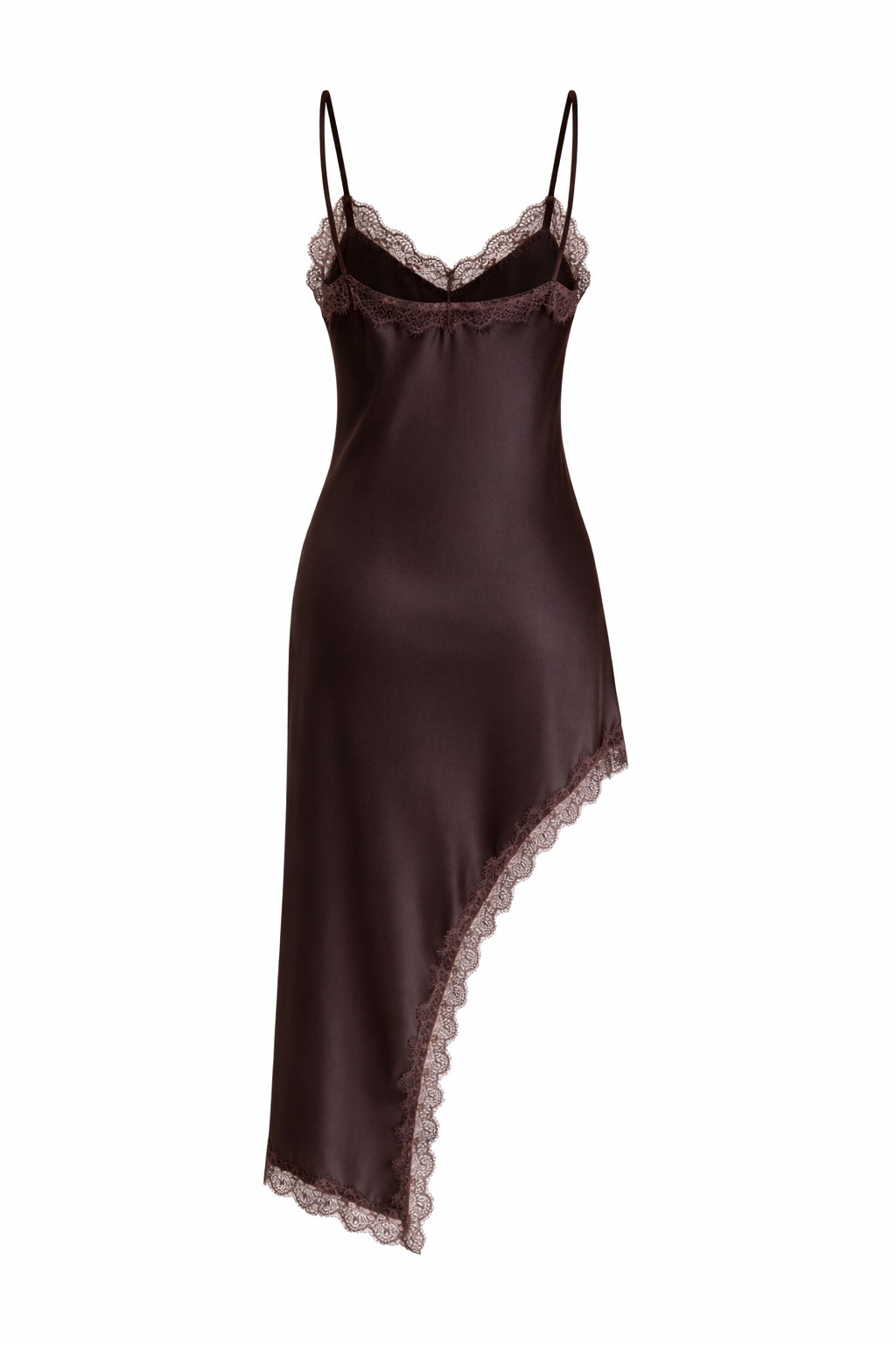 Asimetriška satino suknelė su nėriniais | Juoda ir šokolado spalvos