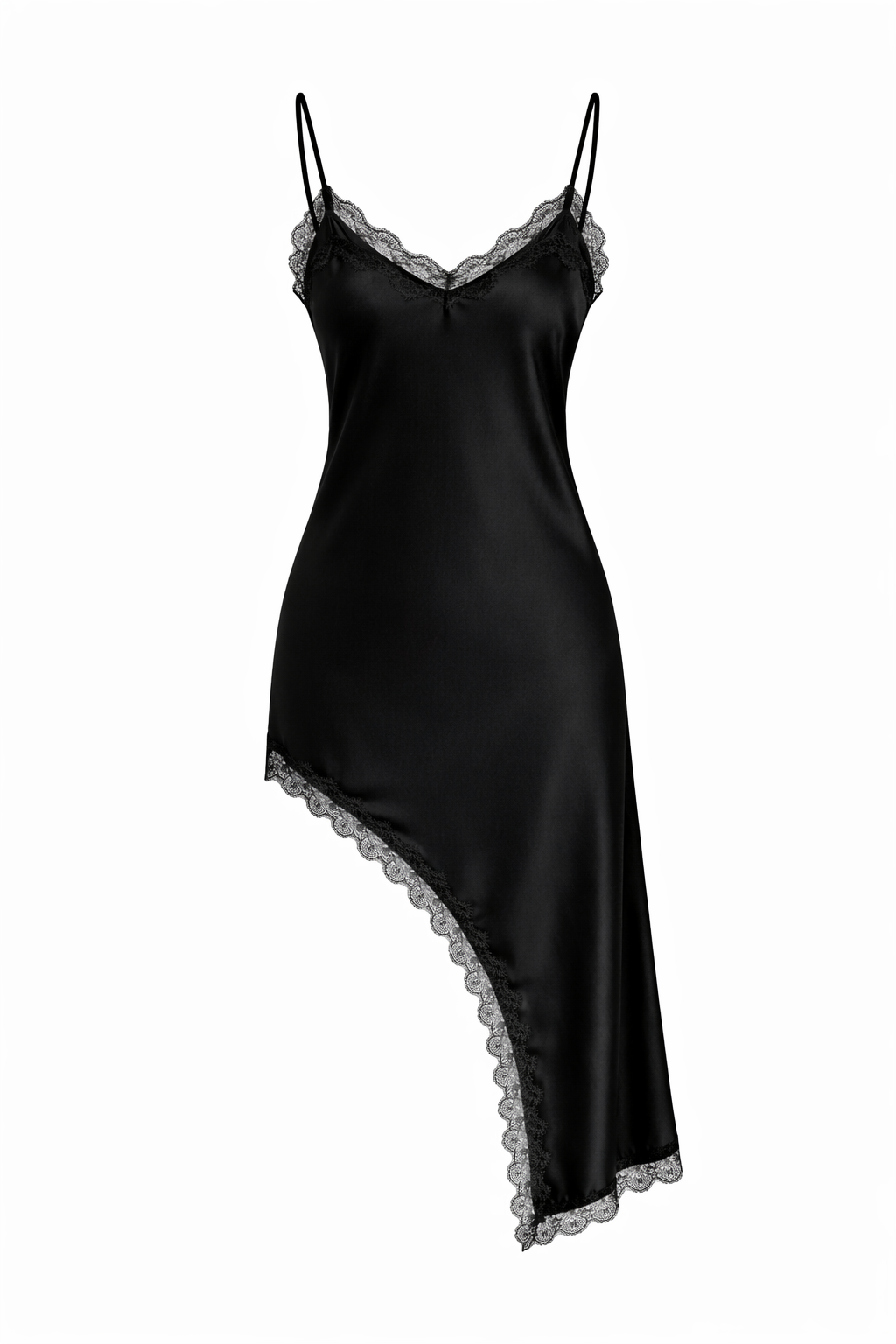 Asimetriškas kirpimas su dailia nėrinių apdaila kuria modernų, išskirtinį įvaizdį, kuris traukia žvilgsnius ir leidžia jaustis ypatingai kiekvienoje situacijoje. Plonos petnešėlės ir švelniai krintanti forma suteikia lengvumo bei elegancijos pojūtį.