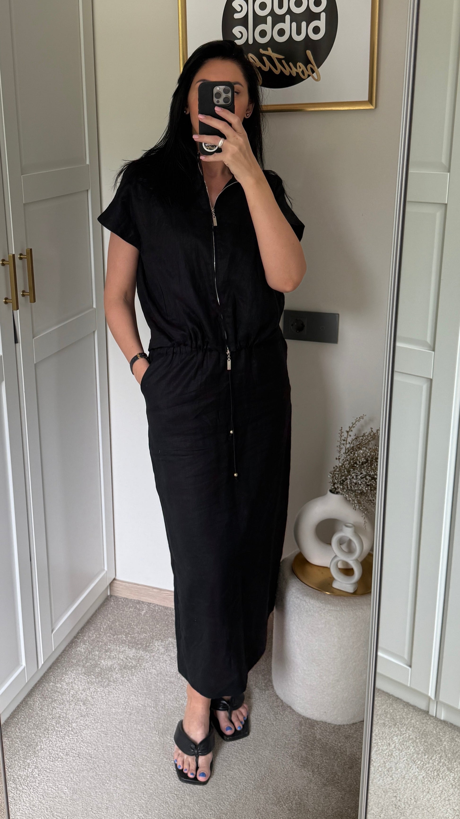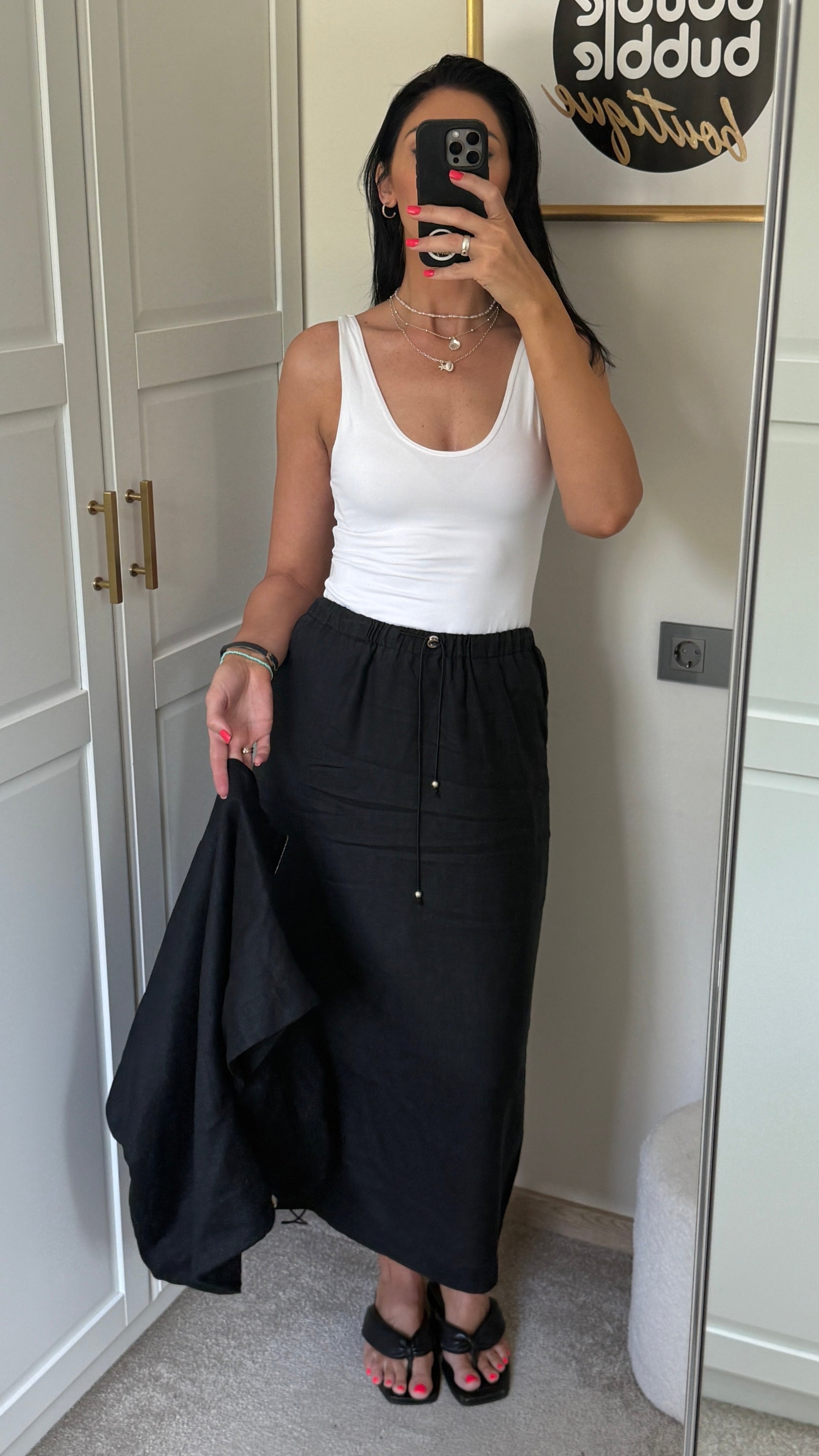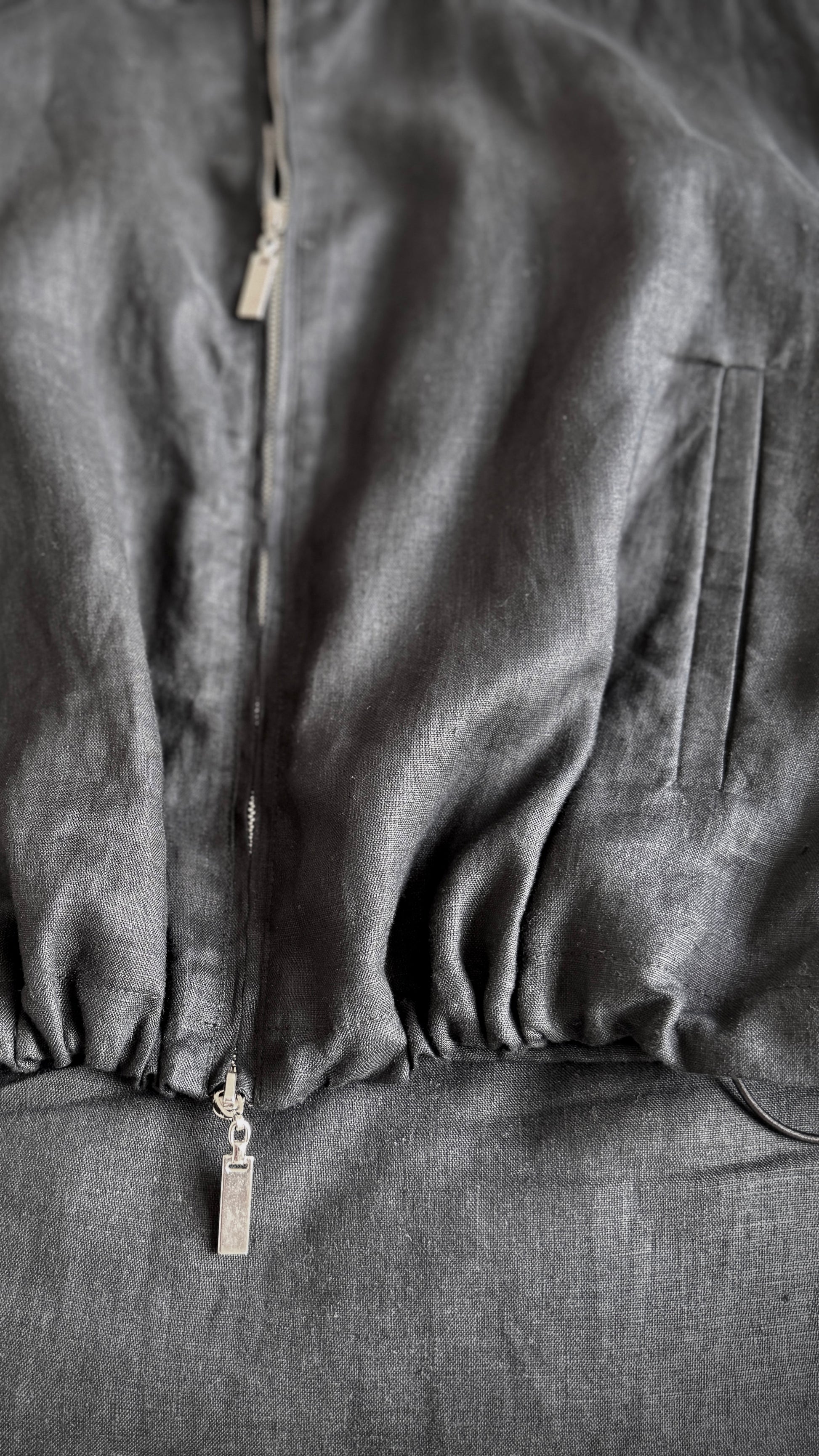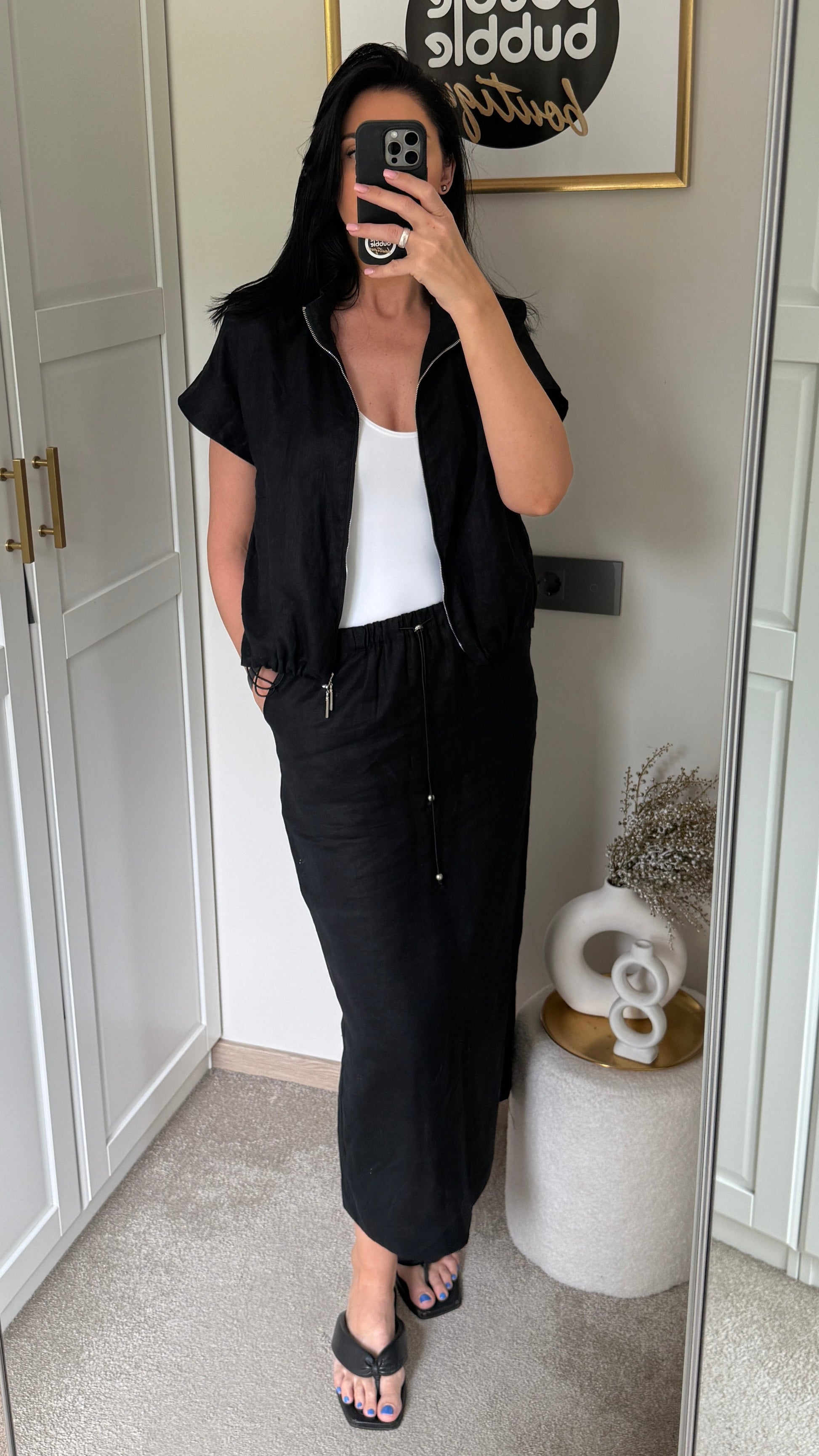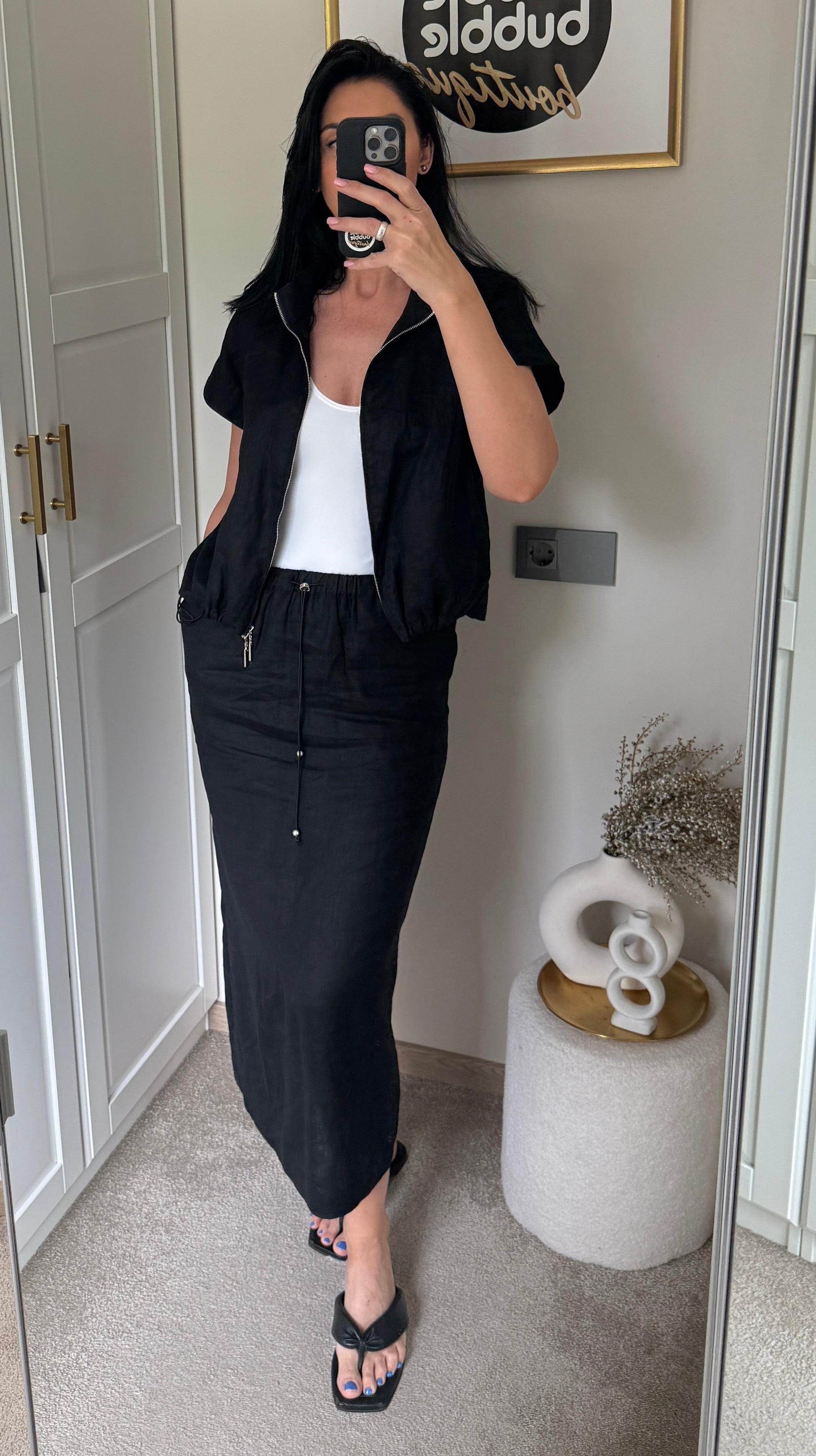 Tobulas lino kostiumėlis - midi ilgio sijonas su kišenėmis (sutraukiami liemeniu) ir užtrauktuku užsegamas stilingas švarkelis (apačia reguliuojasi sutraukiamų raištelių pagalba).