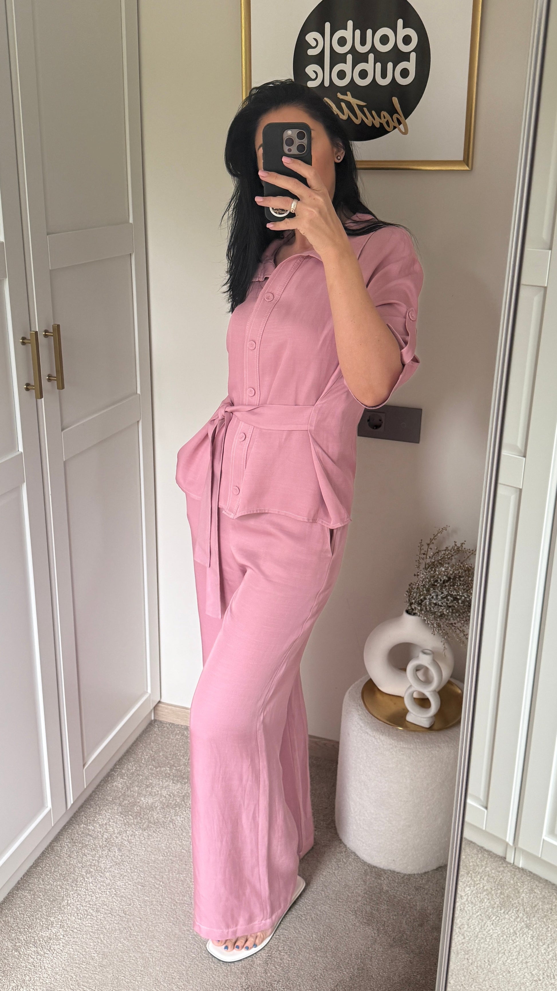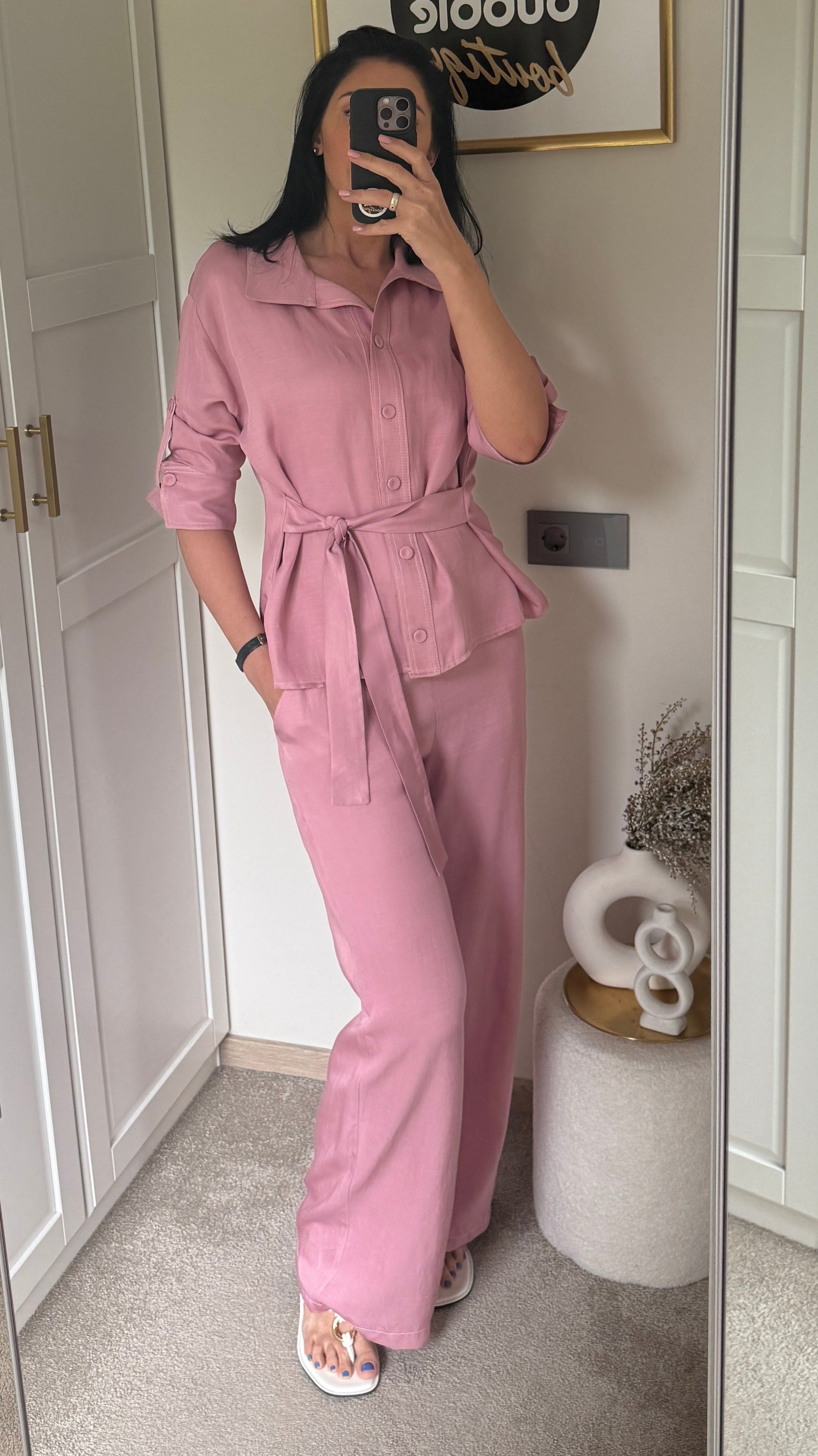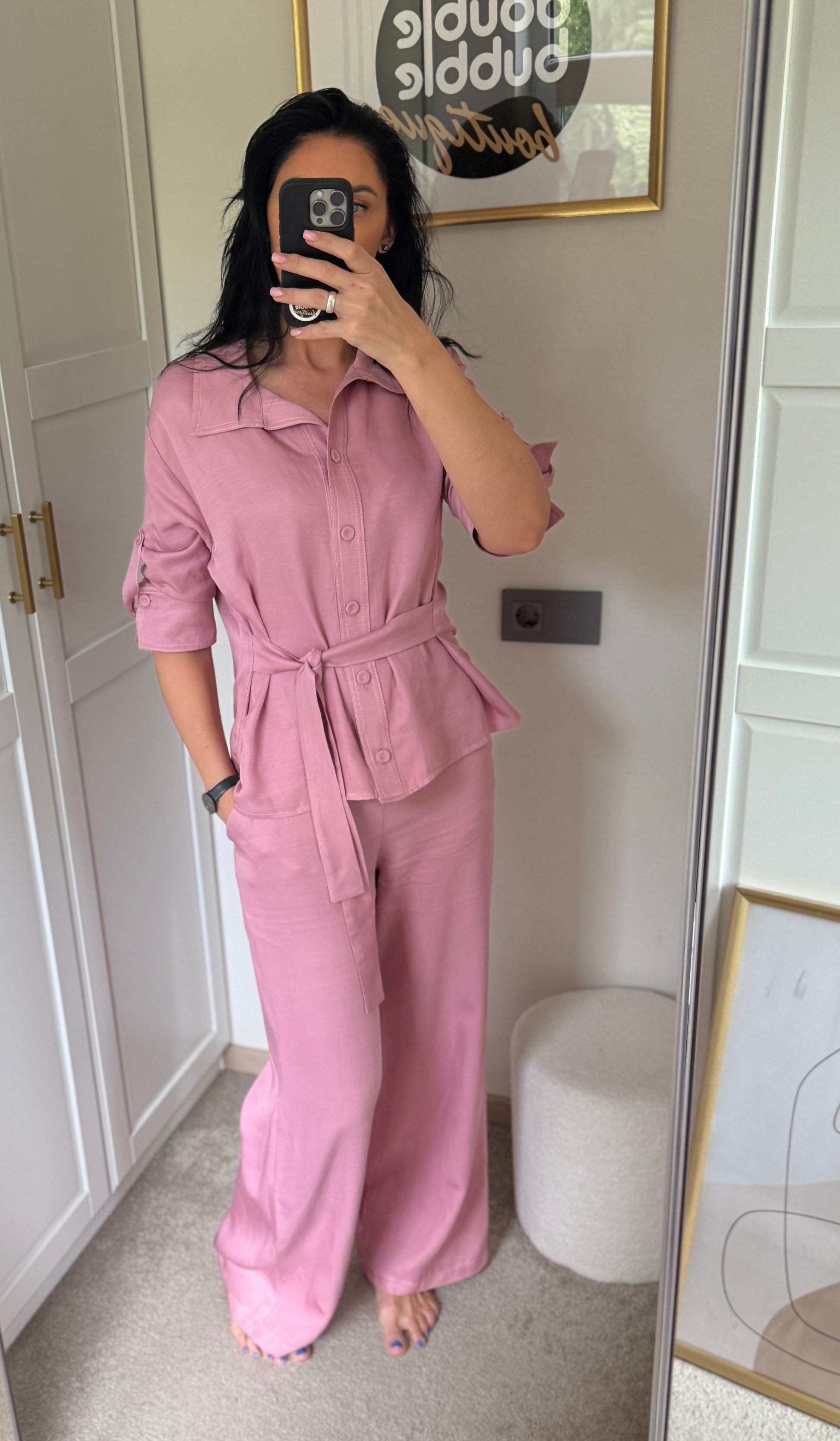 Rausvas lino kostiumėlis