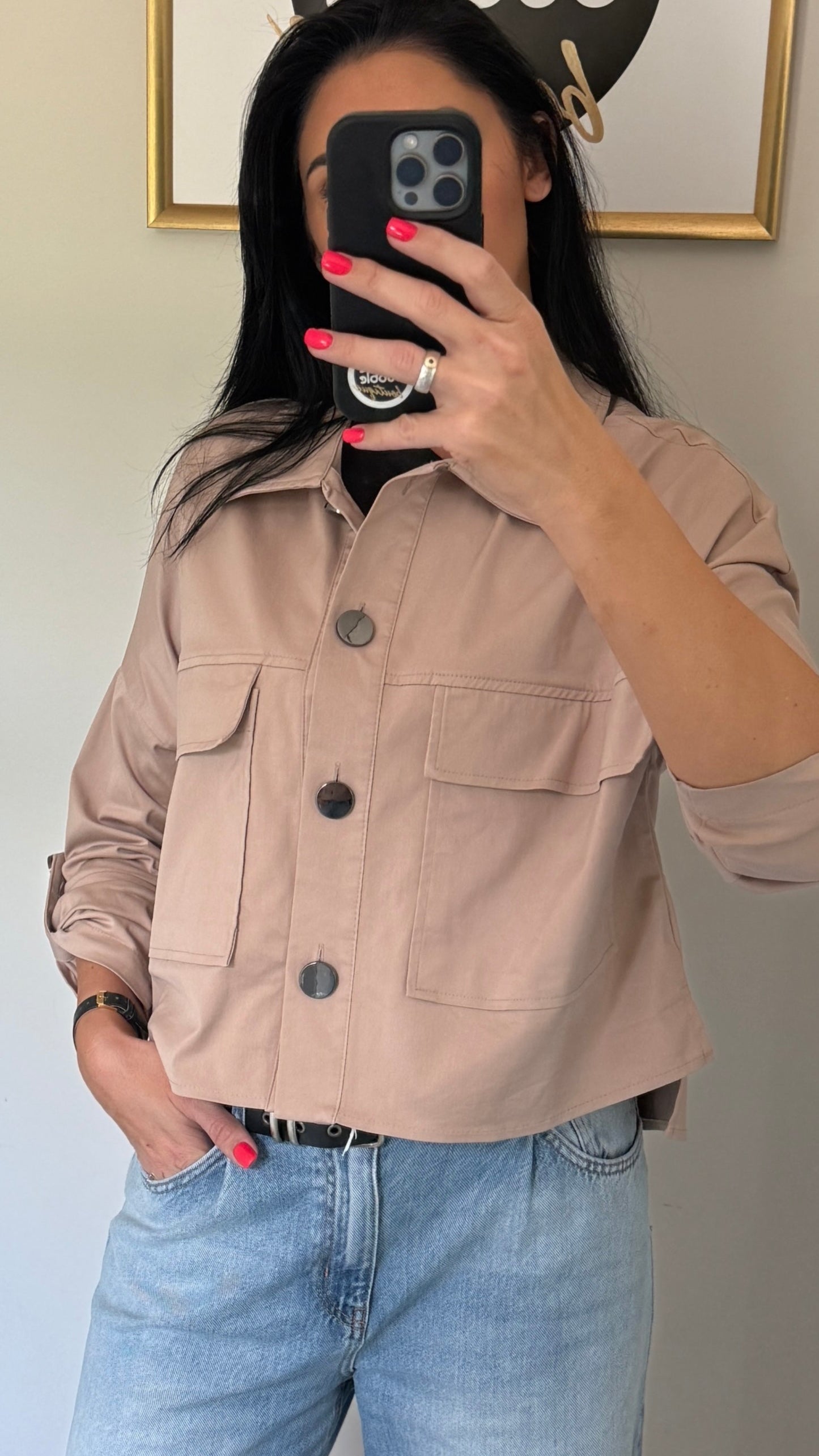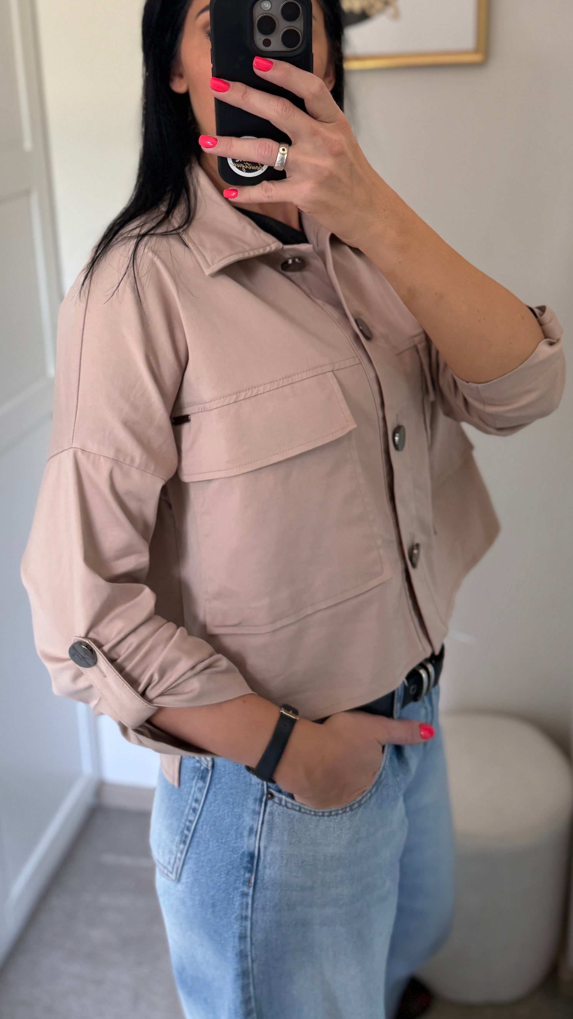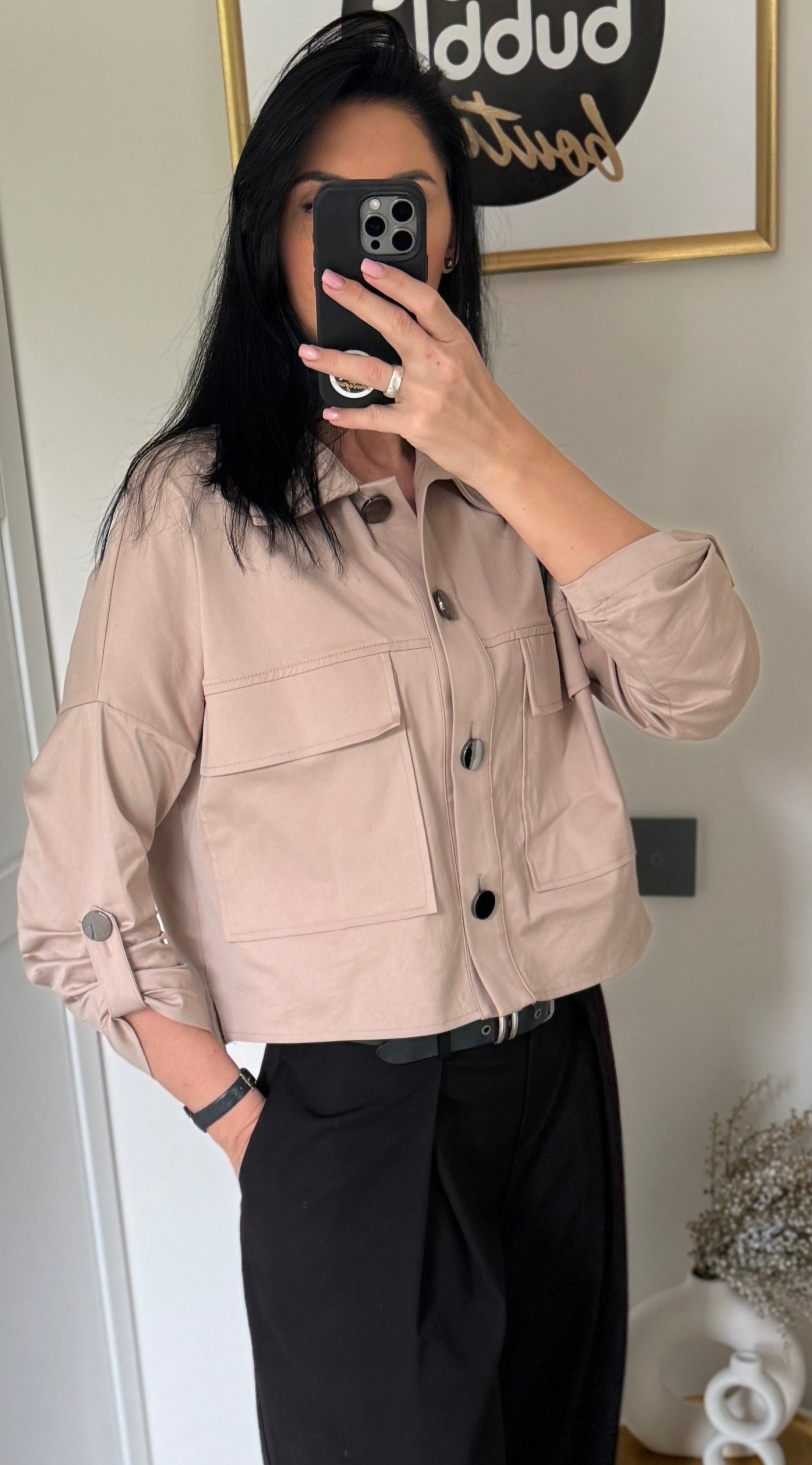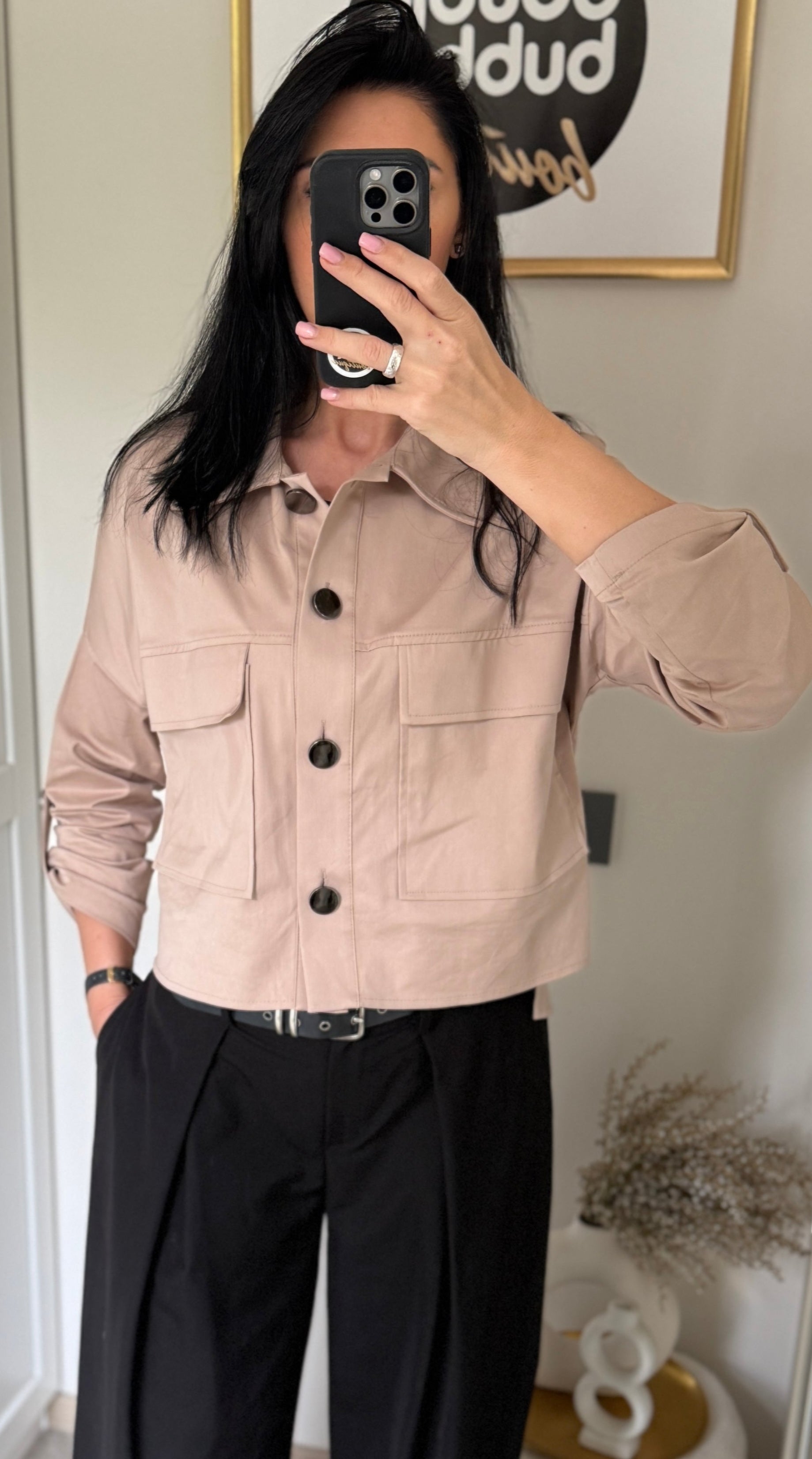 Stilingas, oversize, patogus švarkelis su įdomiomis detalėmis (sutraukiamos rankovės, dekoratyvios sagos, pridėtinės kišenės). Švarkas puikiai tinka ir prie džinsų, ir prie klasikinių kelnių ar sijono.