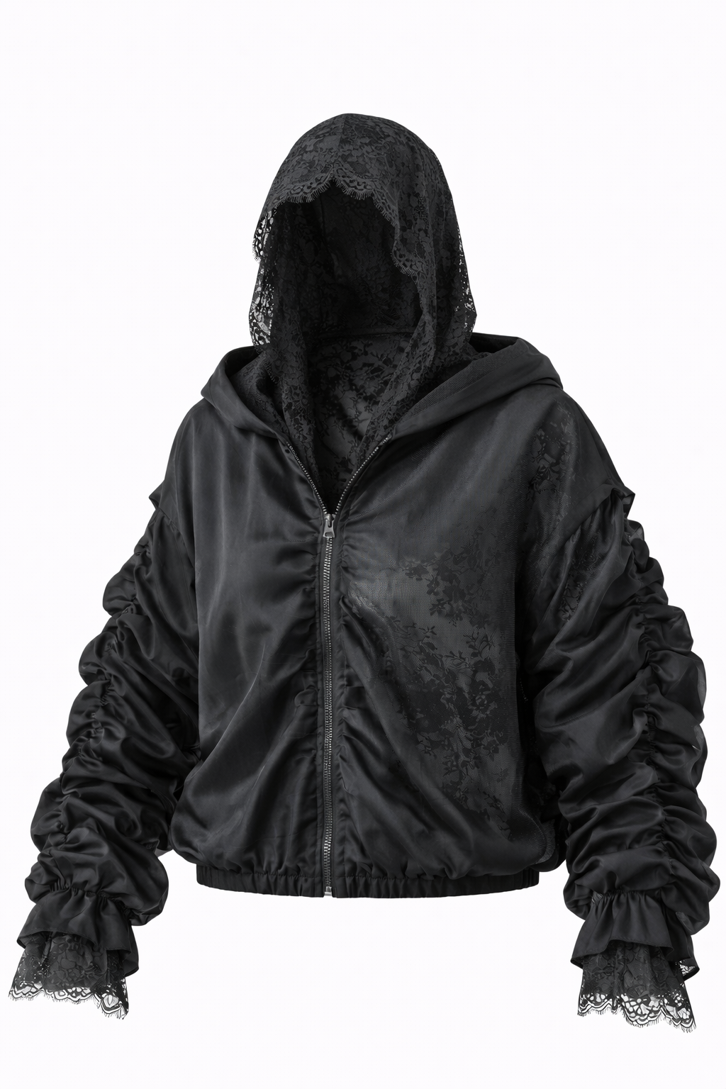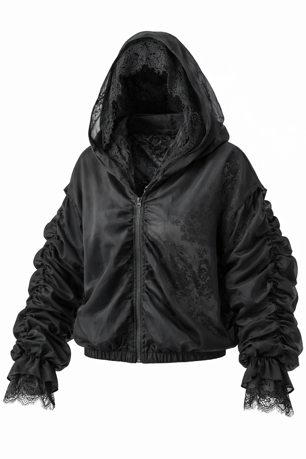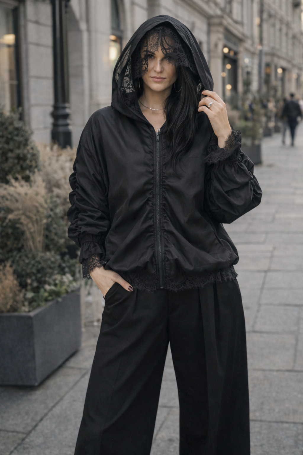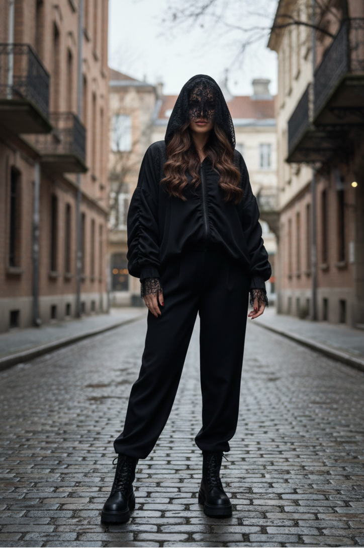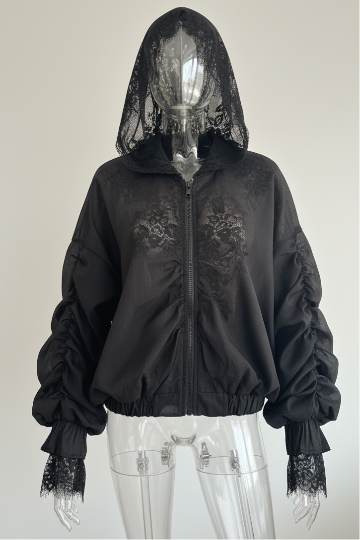 Bomberis pasiūtas iš dviejų sluoksnių: viršutinis – lengvai permatomas, suteikiantis lengvumo ir šiuolaikiškumo, o vidinis – prabangūs nėriniai, kurie subtiliai atsiskleidžia judant ir sukuria išskirtinį gylį. Dvigubas kapišonas ne tik stilingas, bet ir labai efektingas – nėrinių sluoksnis suteikia romantikos, o viršutinis – modernumo.