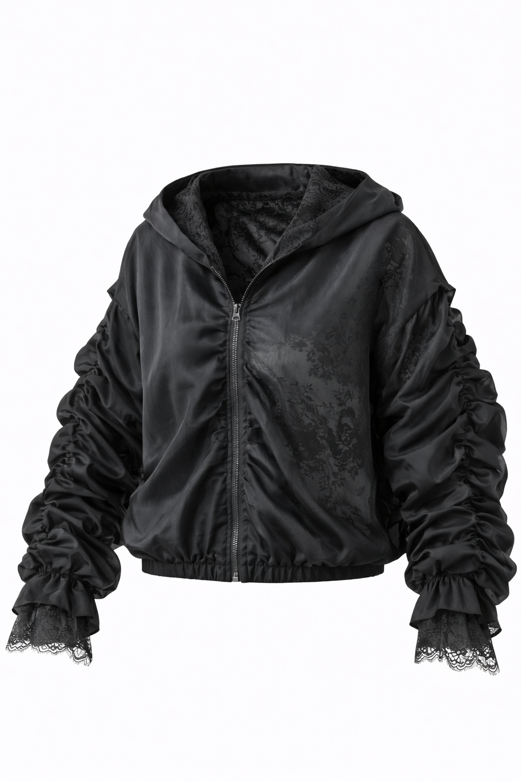 Stilimgas dviejų sluoksnių bomberis su nėriniais ir dvigubu kapišonu