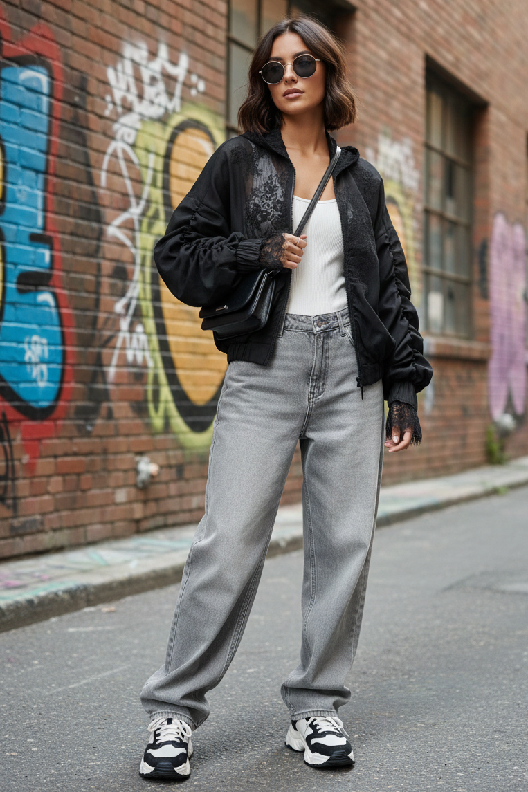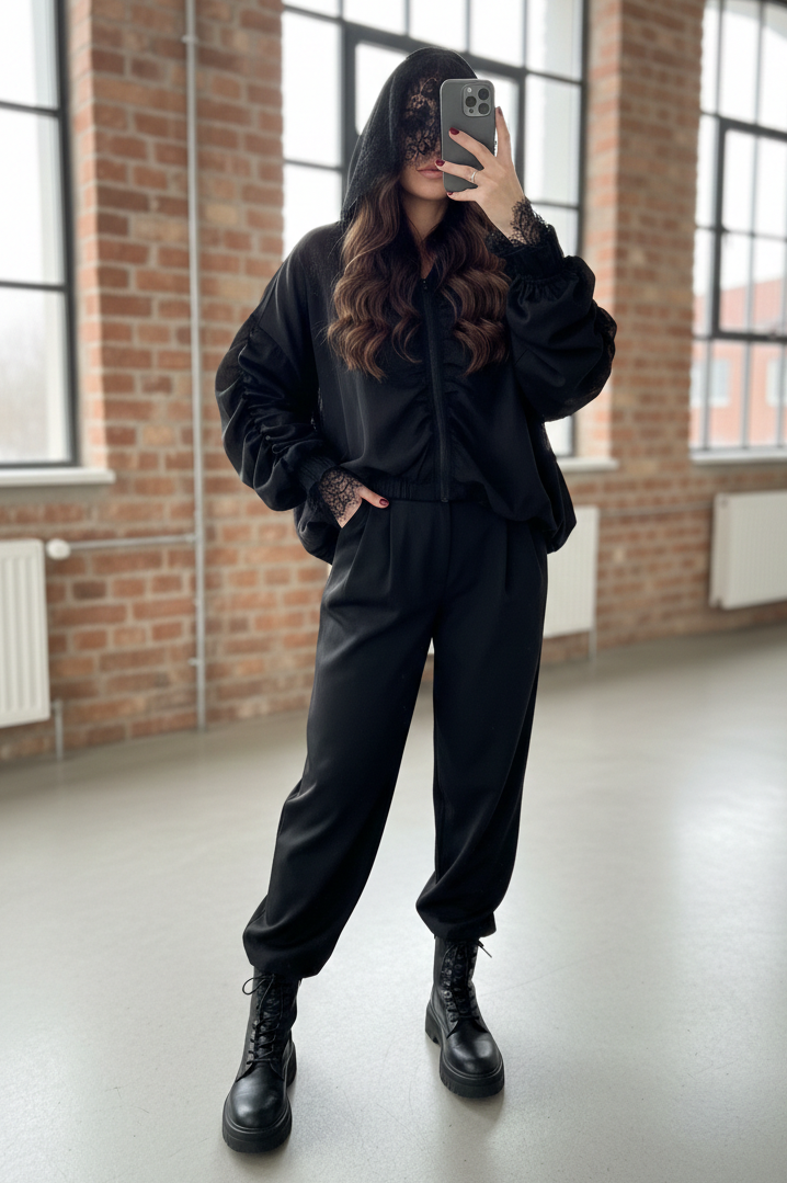 Šis išskirtinio dizaino juodas bomberis su nėriniais – tai drąsus elegancijos ir modernios mados derinys, sukurtas moteriai, kuri mėgsta išsiskirti. Lengvas, bet vizualiai itin įspūdingas modelis traukia žvilgsnius subtiliomis detalėmis ir kuria paslaptingą, rafinuotą įvaizdį.